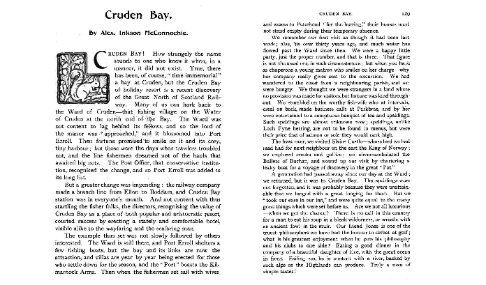 CRUDEN Bay! How strangely the name sounds to one who knew it when, in a manner, it did not exist. True, there has been, of course, “time immemorial” a bay at Cruden, but the Cruden Bay of holiday resort is a recent discovery of the Great North of Scotland Railway. Many of us can hark back to the Ward of Cruden—that fishing village on the Water of Cruden at the north end of the Bay. The Ward was not content to lag behind its fellows, and so the lord of the manor was “approached,” and it blossomed into Port Erroll. Then fortune promised to smile on it and its cosy, tiny harbour; but those were the days when trawlers troubled not, and the line fishermen dreamed not of the hauls that awaited big nets. The Post Office, that conservative institution, recognised the change, and so Port Erroll was added to its long list.