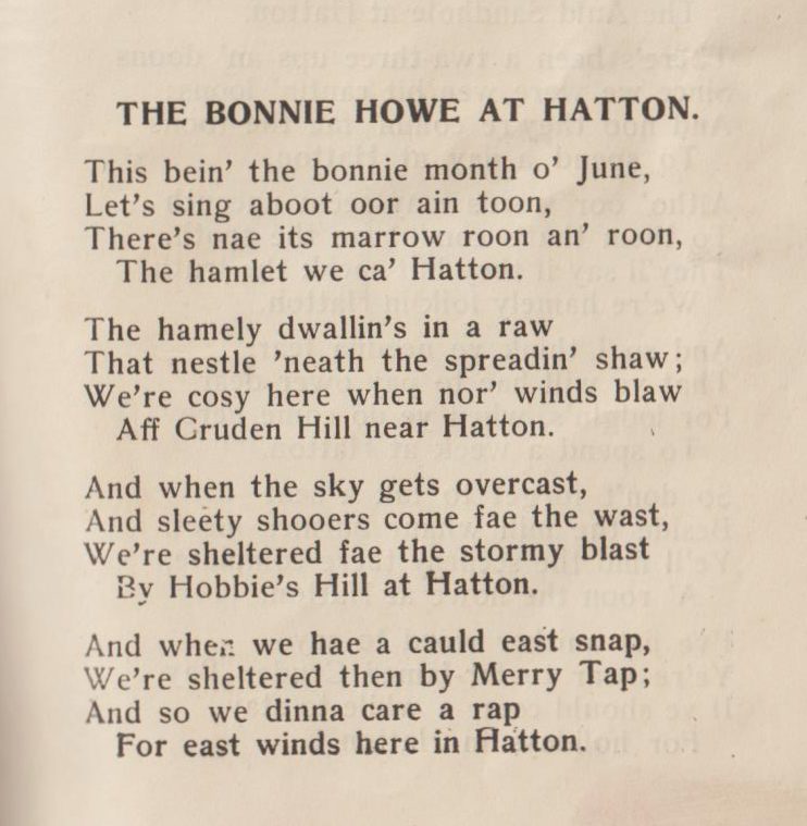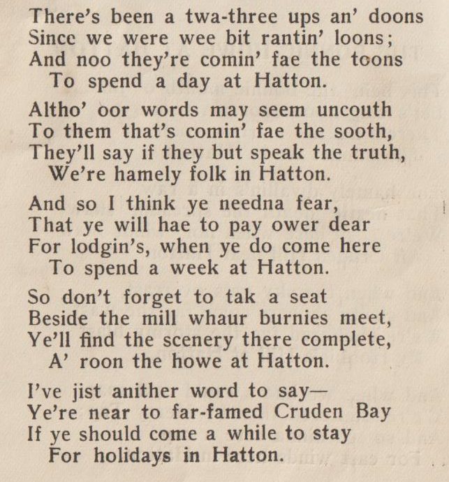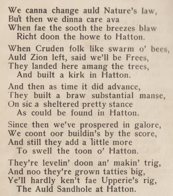 A 1911 poem from Sylvia Munros book “Lilts Frae Cruden Bay”. The poem is about Hatton of Cruden and written By Port Erroll Poet James Ogston.