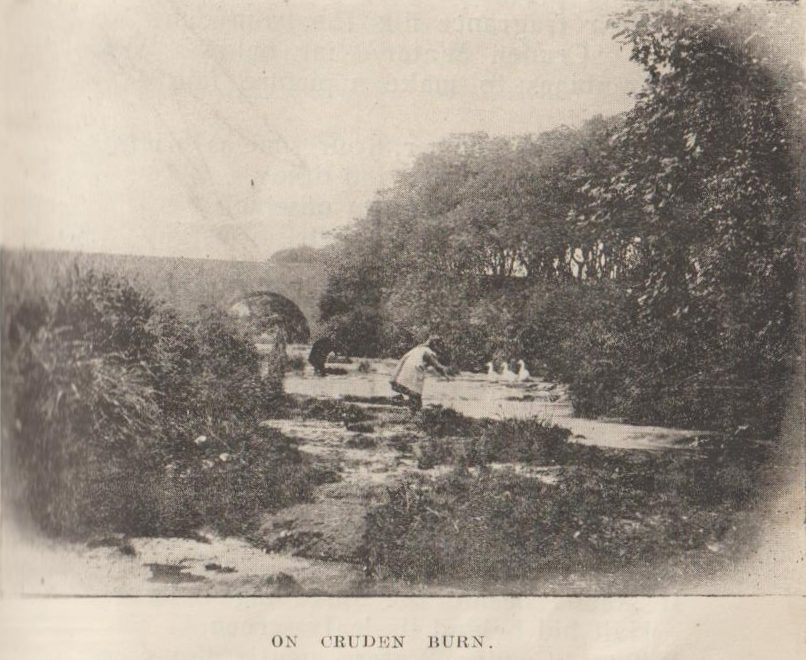 Another photo from Sylvia Munro‘s book “Lilts Frae Cruden Bay”. It is good to see children playing in the Burn, it reminds me of my youth in Cruden Bay in the 1960s when we used to do the same thing. Is that 3 ducks I see to the right? Also the photo must be pre 1908 as the old two arch bridge is in the background.