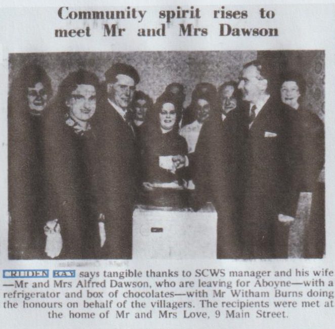 CRUDEN BAY says tangible thanks to SCWS manager and his wife—Mr and Mrs Alfred Dawson, who are leaving for Aboyne—with a refrigerator and box of chocolates—with Mr Witham Burns doing the honours on behalf of the villagers. The recipients were met at the home of Mr and Mrs Love, 9 Main Street.